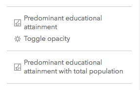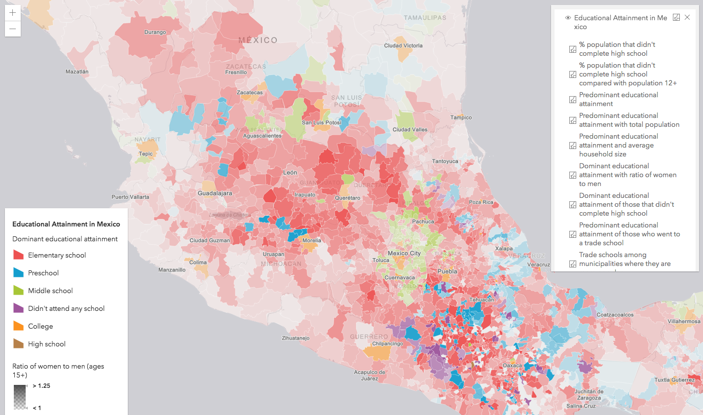 LayerList actions are associated with specific layers in the widget. The following sample provides another example of how LayerList actions can be used. Prior to creating this sample, I enriched a layer of municipal boundaries in Mexico with education and population attributes. I then added this layer to ArcGIS Online and copied it twelve times, assigning different renderers to each copy of the layer. Because I found these various visualizations interesting I decided to create an app that allows users to easily toggle these visualizations on the same layer without loading 12 separate layers of the same data and thus unnecessarily querying duplicate data.