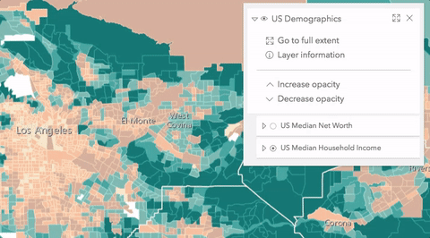 - LayerList widget with actions – adds multiple actions to a LayerList widget that allow the user to view service information for the given layer, zoom to the full extent of the layer, and change the opacity of the layer.