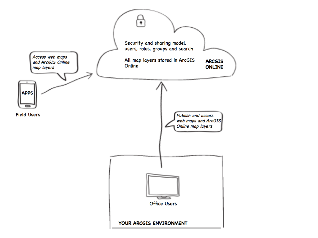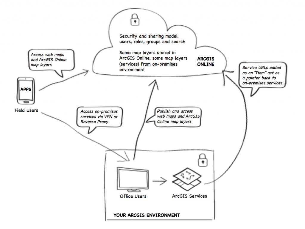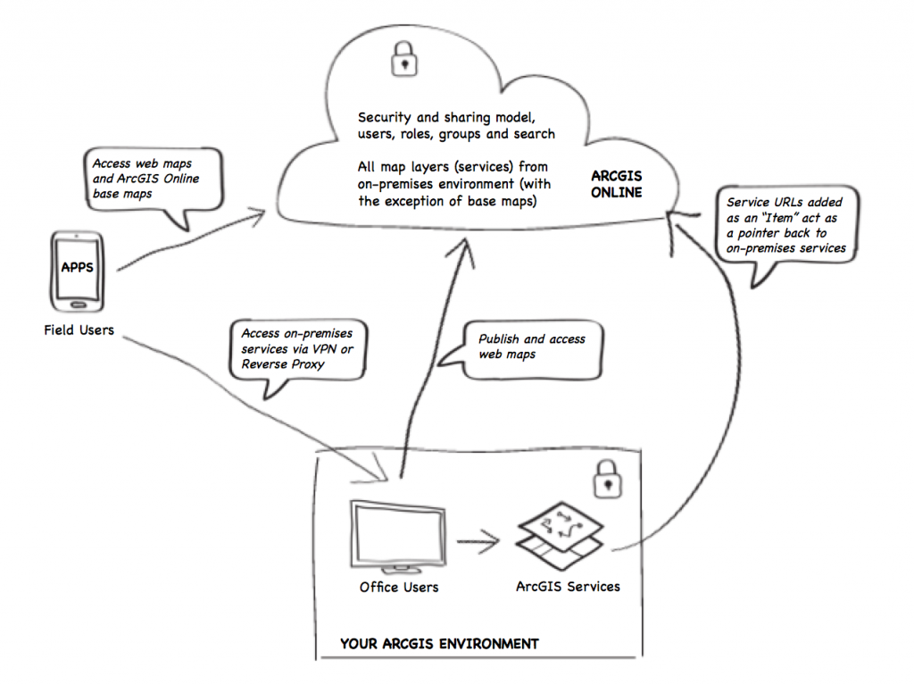 - Hybrid deployment – using ArcGIS Online for both its SaaS and data storage capabilities and using on-premises data