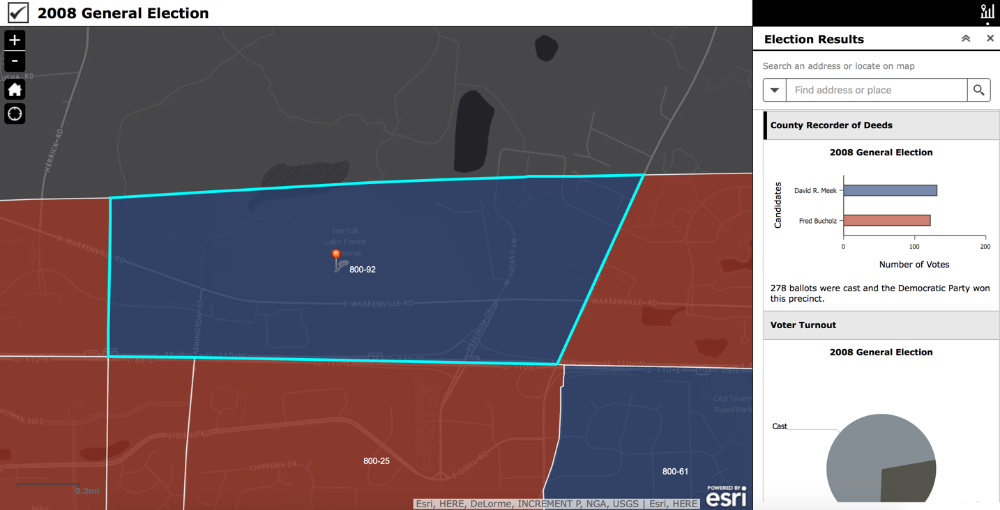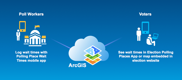 ArcGIS now includes a series of recently released solutions that enable governments to quickly deploy apps that inform citizens about where to vote, how long the wait to vote is, what were the results of an election and who is currently in an elected office. Organizations that license ArcGIS can download these election solutions at no additional cost.