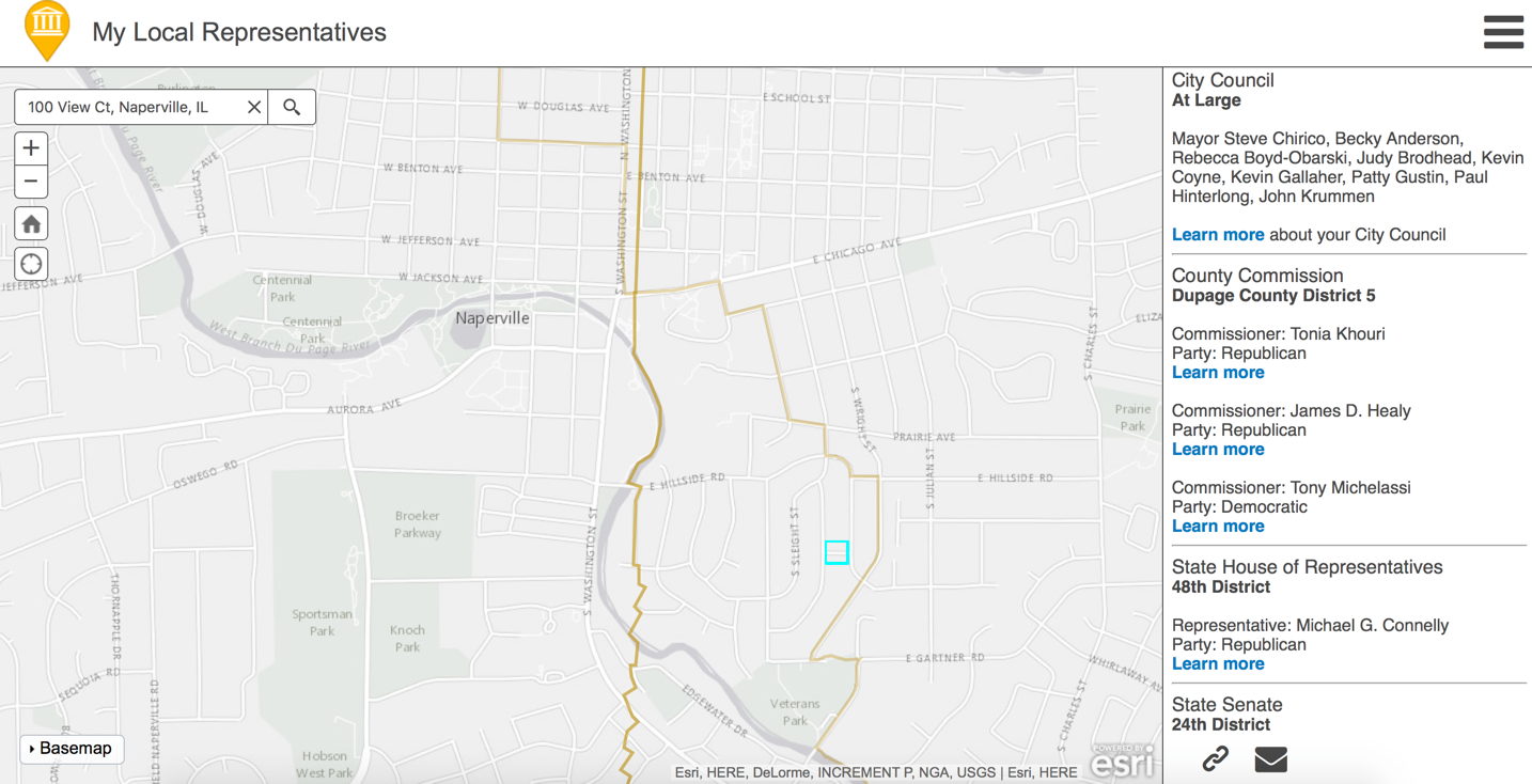 My Elected Representative tells citizens who currently represents them in local, state and federal elected offices. The app also provides information about how to contact elected officials. Through the configuration process organizations can choose to put all levels of elected representation in a single app or create multiple apps for each level of representation.