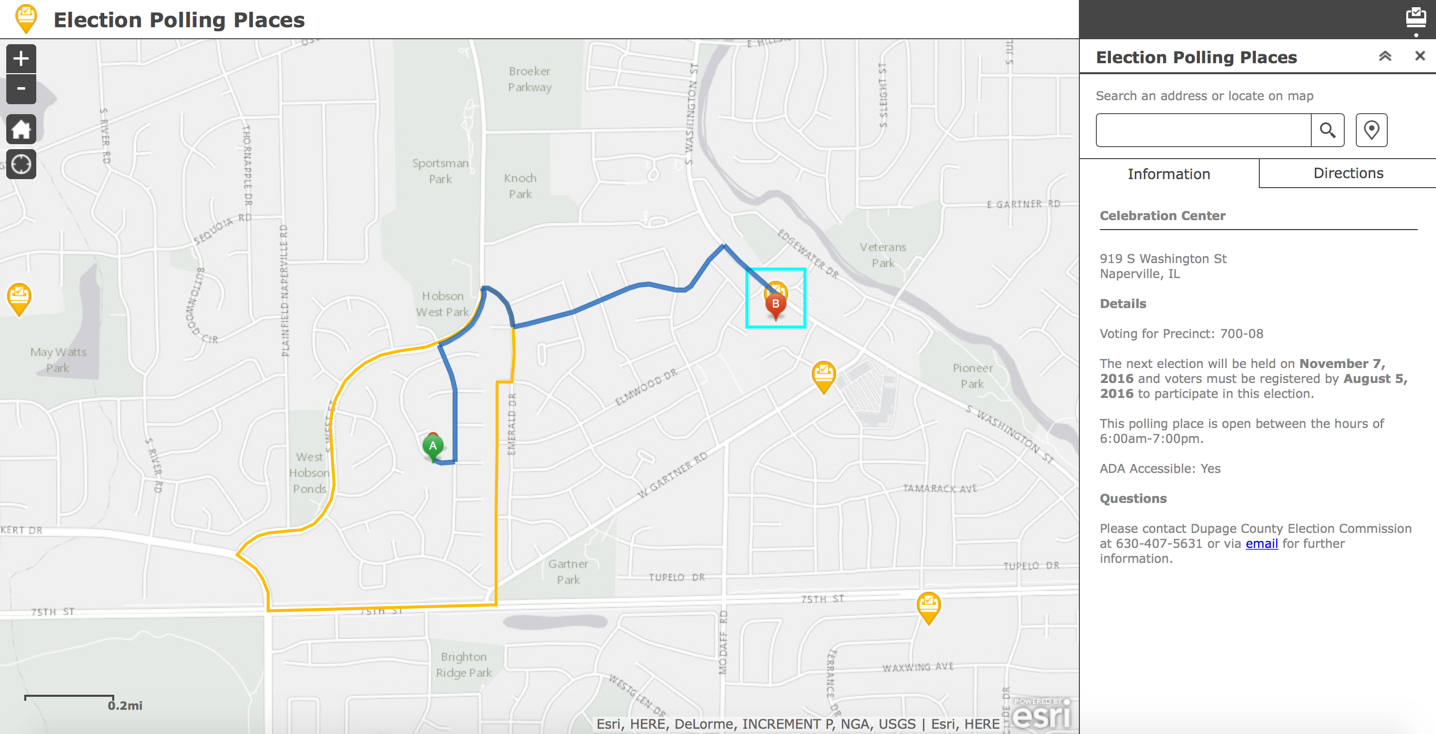 Election Polling Places helps citizens find where they can vote on election day. Election Polling Places shows the location of polling places, allows citizens to input their address or click a location on a map to see the assigned polling place and can provide driving directions. The app can also be configured to show detailed information about polling places such as precincts served, voting hours and ADA accessibility.