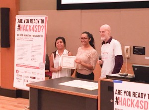 On the first weekend, a number of stakeholders pitched their problems, ideas, and resources to the participants, using those three themes above. After that, 9 teams were formed, and they brainstormed on which problems to attack and how, using their own innovative ideas. For the rest of the first weekend and continuing on through that week, the teams worked to design and build their solutions. Finally on Saturday, Oct 10th, the teams reassembled to present their work. Of the original 9 teams to begin, 5 of those teams made it to the finish line. Of those 5 teams, 3 of them used ArcGIS as part of their solution, and one of the teams “Team Dozier” finished in 2nd Place overall. Jessica Dozier is a grad student at SDSU studying Geography/GIScience, and her sister Christine Dozier is a 4th year undergrad, also at SDSU studying health communications and nursing.