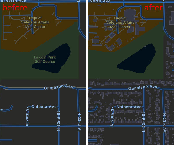 Because Esri creates a single tile set for use in all the vector map styles, most community contributed data not only appears in the vector Topographic map style, but also in Light and Dark Gray Canvas, Street Map, Navigation, etc. - Map styles can be customized by users.