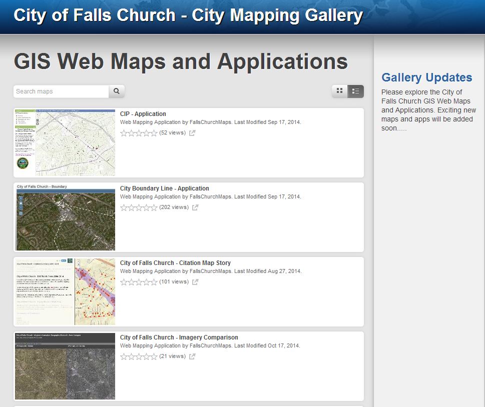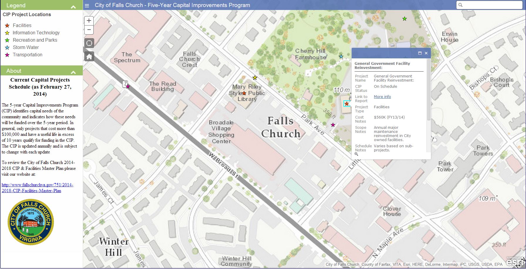 The Falls Church, VA Map Gallery includes a variety of web maps and apps that include topics ranging from Flood Zones, Snow Removal and this Capital Improvements app identifying the capital needs of the community and indicates how these needs will be funded over the 5-year period.