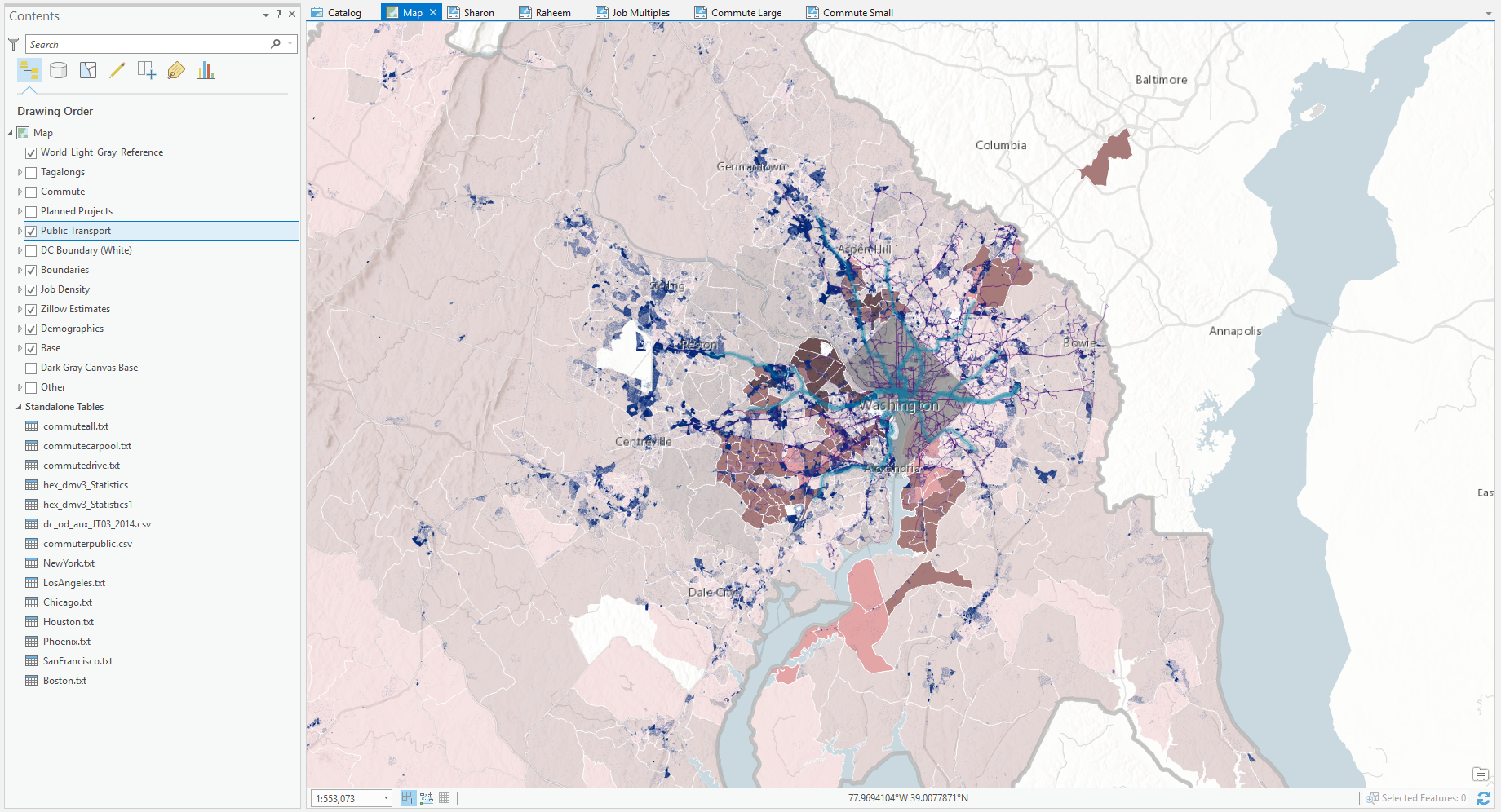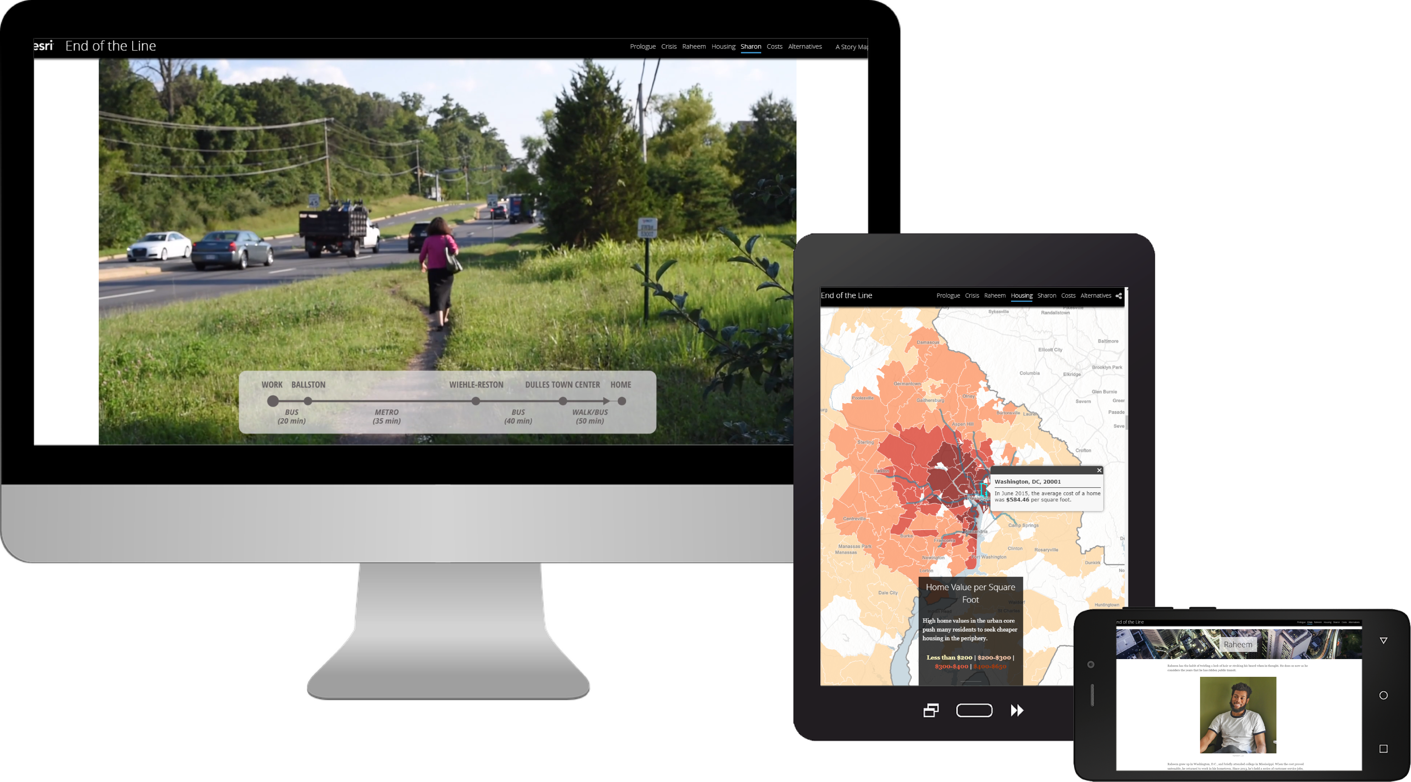 The result: A Story Map Cascade that follows the narrative threads of Raheem and Sharon, and uses those threads to “reveal” pieces of data along the way: Washington, D.C. transit networks, Zillow home values, LEHD job locations, and Esri Demographics income levels. In the process, the story creates a rhythm as it cycles between personal accounts and maps.