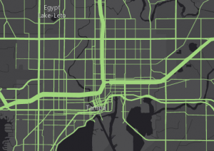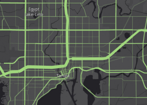 The following maps show the subtle difference achieved by using transparency. The second map uses the same attribute for size and transparency, revealing the busiest highways in Tampa, FL by letting less busy roads “recede” into the map (due to data-driven transparency).