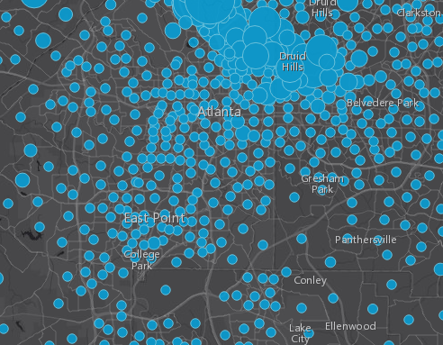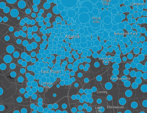 The following maps show the average household income for Atlanta, GA. The first image uses a continuous ramp through all values of the data, while the second map starts showing larger circles only once a value is above average (the technique just described). In comparison, the second map shows a more definitive pattern of above-average incomes in the Druid Hills area.
