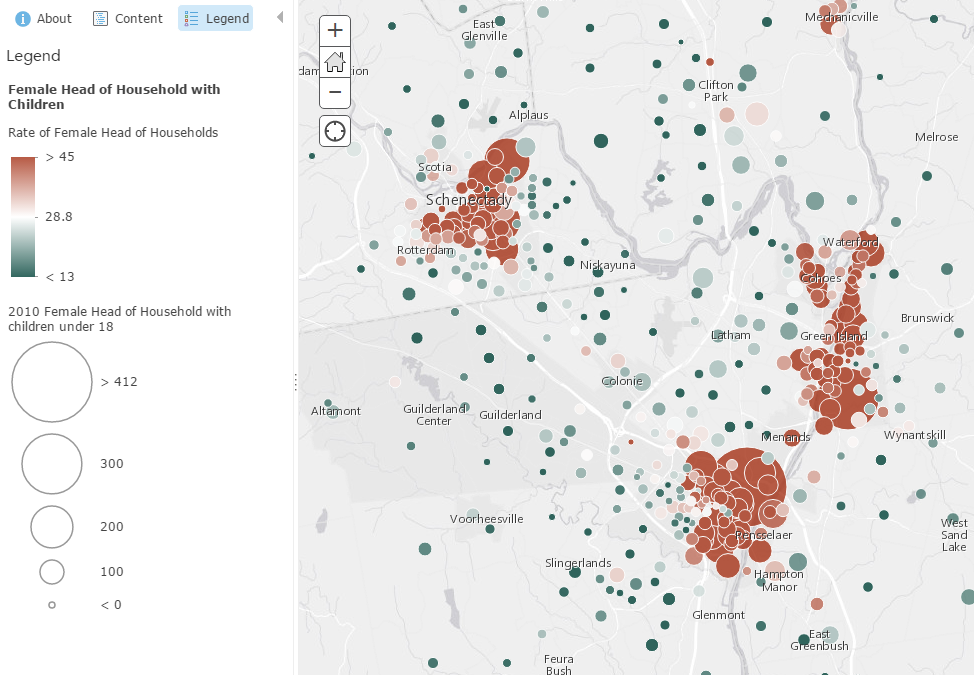 For example, if you want to explore the pattern of single-parent households, size can show the total numbers, while the color can highlight where the highest percentage exist. This technique pinpoints areas that have a high count and percentage of single parent households.