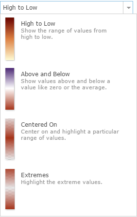 Tip: When mapping thematically, try changing the theme to see your data in a new way. Try using Above and Below or Centered On options. Mapping something with important high or low values? Try High to Low or Extremes. Each theme has color ramps designed for use with that theme and current basemap on your screen. Click on a color ramp to see how it looks. Then think about your audience- do the map’s colors give the first impression you want them to have?