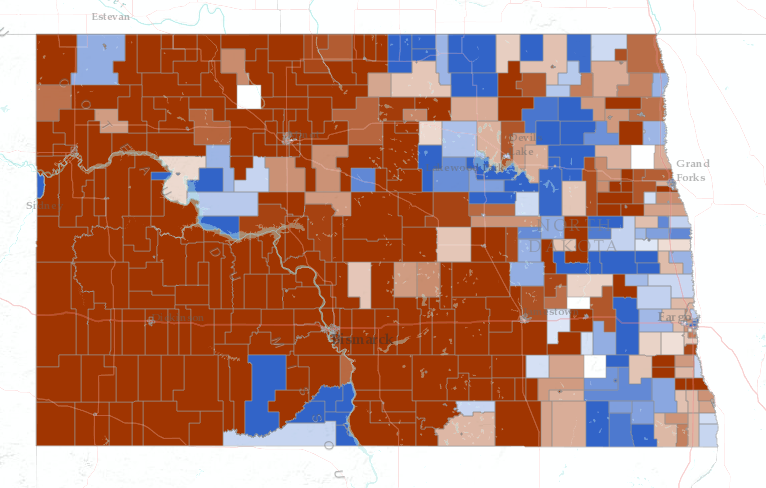 An election map is an example of a predominance map. An election map simply tells you which of two or more candidates has the highest total vote count. For example, this map shows the predominant count of votes for President in North Dakota voting precincts from the 2008 election. Darker colors indicate a higher predominant vote for that party. Lighter colors indicate that party barely won the precinct. White represents an exact tie.