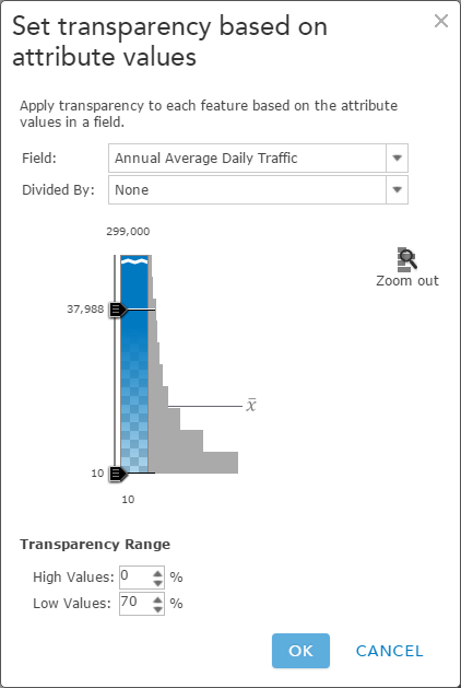 Transparency can add emphasis to the patterns in your data. Whether you want to highlight a pattern or a statistically significant value, transparency makes patterns more understandable. Choose an attribute field from your data to control the transparency, then adjust the transparency range.
