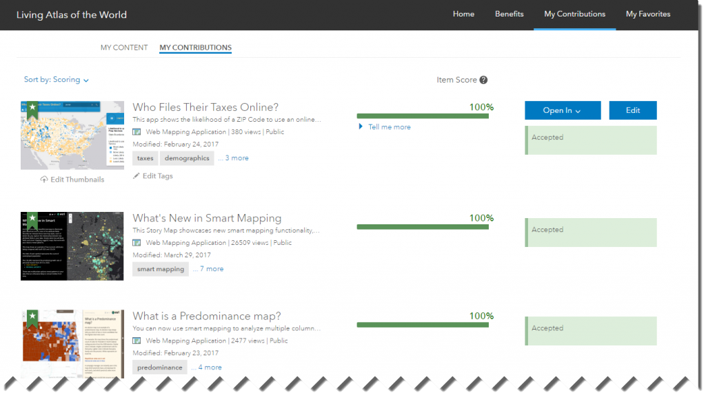 Within the Living Atlas site, the “My Contributions” tab shows items you own. The My Content tab shows which items are eligible for nomination, and the My Contributions tab shows the items which you have already contributed. Each item is scored by the completeness of the item and its metadata. The score helps to identify key characteristics of your item which will make sure others can find and understand the item. Sections left blank, or with too little content, decreases the score of an item.