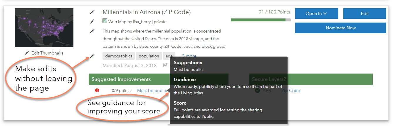 Click on an item to view the scoring, make edits, see suggested improvements, and to nominate an item. You can make certain edits directly to your item by using the editing pencils. You can also hover over the suggested improvements for more guidance.