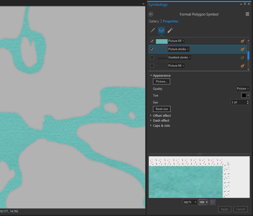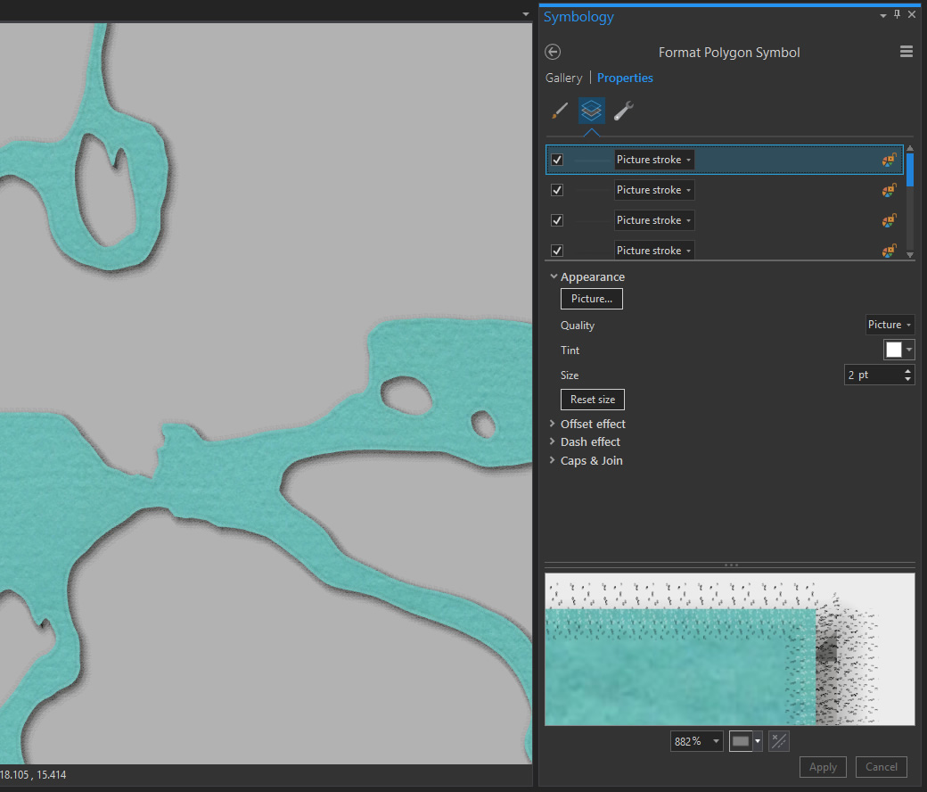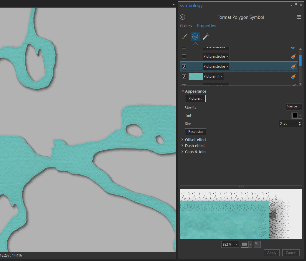 In ArcGIS Pro, you can stack up all manner of symbol layers to represent your point, line, or polygon. For these fake paper maps, I’ve made 11 symbol layers to represent one shapefile. Yes, 11. When it comes to feathering reality, go big or go home.
