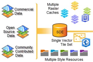 1) Updated data. Because the amount of time required to produce our vector basemap tile set is greatly reduced compared to raster caching, we are able to make more frequent tile updates. With each update, we publish the latest set of our data. We collect and process data from commercial sources, open sources, and our community contributions made to the Living Atlas of the World. Even during the beta period, we are able to release data from these sources in a shorter turn-around time than to our raster basemaps. Each vector basemap style points to the same single vector tile set. Compare that to rasters where each map style produces its own set of cache.