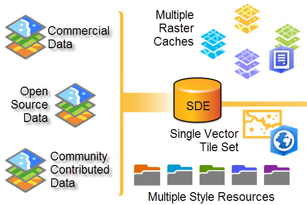 2) Community Data. Many of the feature classes contributed through the community map program appear in all the basemap styles each time updated tiles are published. This is because all the different vector basemap styles point to a single set of vector tiles. They are stylized by separate resource files (per style) stored on ArcGIS Online. In the raster maps, each style has to be cached separately.