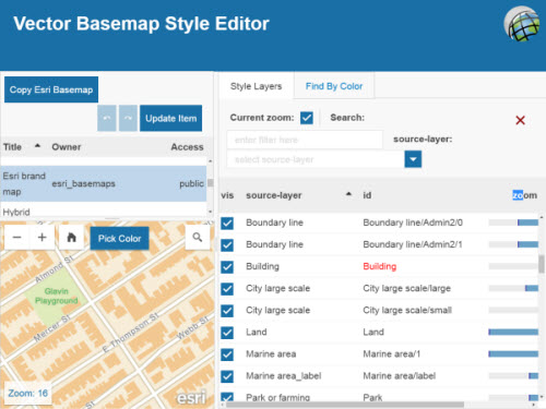 Vector Basemap Style Editor (beta) is a styling app that allows you to quickly and easily turn on and off feature layers, find features by colors, apply bulk color changes for all features with that specific color, and more. Click on the ‘id’ name of a layer and more detailed, json-based edits can be made. Updating the item from the app saves the new style changes in your online account.