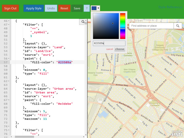 Vector Style JSON Editor (beta) is another styling app that exposes the json code in one half of the window, and the map in the other half. The app offers a color picker and the ability to search and find features to change by layer names or hex colors. Applying changes to the code shows immediate results on the right side of the window. Saving the style changes updates that tile layer in your online account.