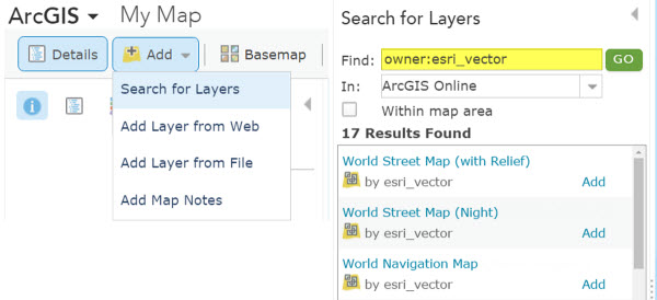 There are two main ways to find the vector tile basemaps in ArcGIS Online, both tile layers and web maps. The first is in this public group: Esri Vector Basemaps (Beta). Bookmark it! This set of 9 tile layers and 9 web maps are the most up-to-date set of our basemaps. They are items owned by “esri_vector”. That leads to the second way to find them. In the map on ArcGIS.com, when you add data, search for layers using the syntax “owner:esri_vector”. This pulls all the vector tile layer styles that are also in the group detailed above.