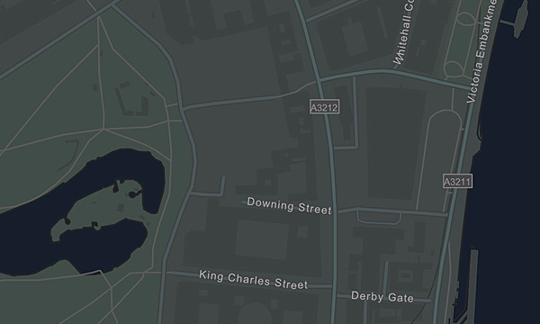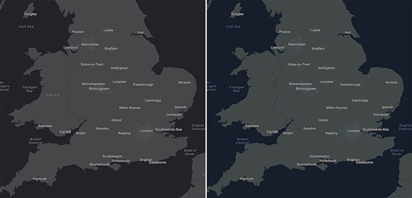 Imagery tends to have a varied palette of earth tones, but in Great Britain it tends towards the green. So my starting point for the map was to change the land color to a dark green. Water tends to be a dark blue-black at larger scales in imagery, so that was adjusted as well. It still needs to function as a basemap, so I did not stray too far from the tonal values used in the Dark Gray version.