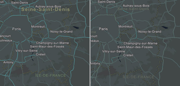 This worked well in the context of my map, but it was not so good in other parts of the world. In France, for example, the 3rd-order boundary labels (e.g., ‘Seine-Saint Denis’) are much stronger than the 2nd-order boundary labels (e.g., ‘Ile-de-France’).