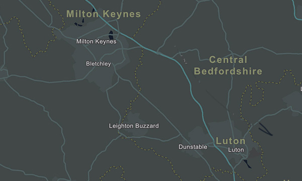 I picked out the Motorway/Highway category of road in a brighter blue to give a sense of where my locations sit in relation to the major road network. I featured third-order boundaries (counties in the UK) using a dashed yellow line, and enlarged the county names to match the line in prominence.