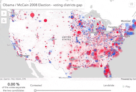 WebGL paves the way for improved user experiences when changing the visualization of features. This is particularly apparent in apps that provide users with UI controls that alter a layer’s renderer for data exploration or style authoring purposes. Check out the sample below, which displays 180,000 voting precinct locations. The user can move the slider to explore precincts that reported similar margins of victory for each candidate. Despite the large amount of data displayed, the visualization updates smoothly and rapidly.