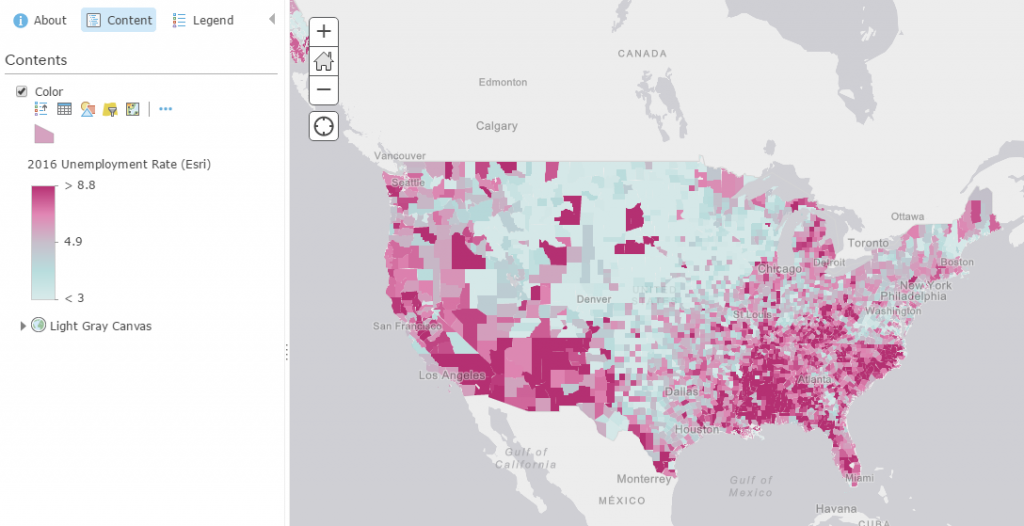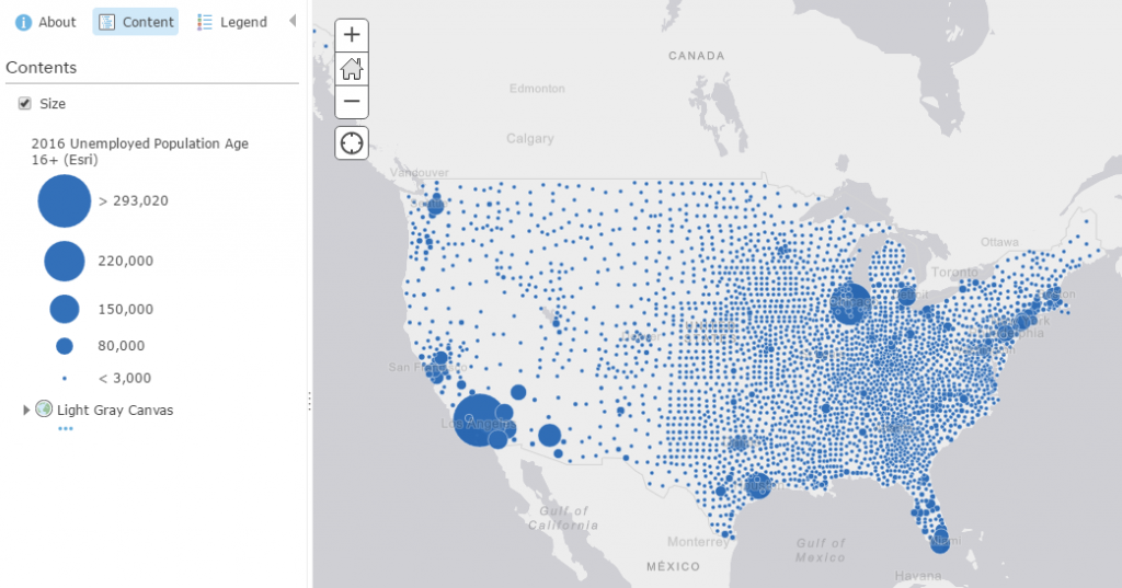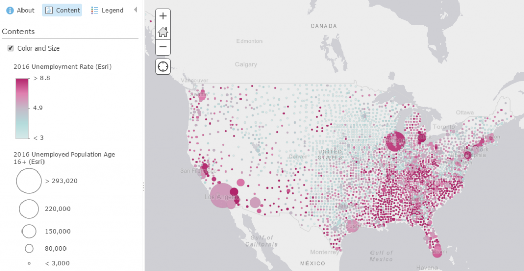 With smart mapping, you can select both of these attributes within the Change Style interface, and get a map where they are shown within the same map. This can highlight interesting relationships between attributes and represent patterns that tell interesting narratives. In this case, the map shows how high unemployment rates don’t necessarily follow the same pattern of high unemployed population. Stand-alone, these are important maps, but together, we can better understand what the numbers mean.
