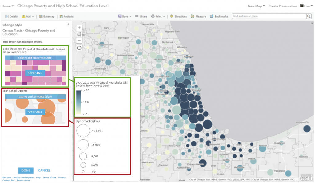 In some cases, using color to represent data values just makes sense. Other times, the size of a symbol creates a clear story for the smallest and largest values. Smart mapping allows you to choose two attributes from your data, and visualize the patterns from each attribute within a single map using both color and size (also referred to as bivariate mapping). This can be valuable for exploring your data, and allows you to tell a story using one map instead of two.