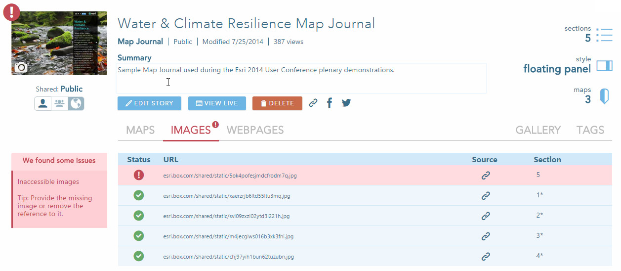 Story Maps with issues will be highlighted, click to expand and view details.