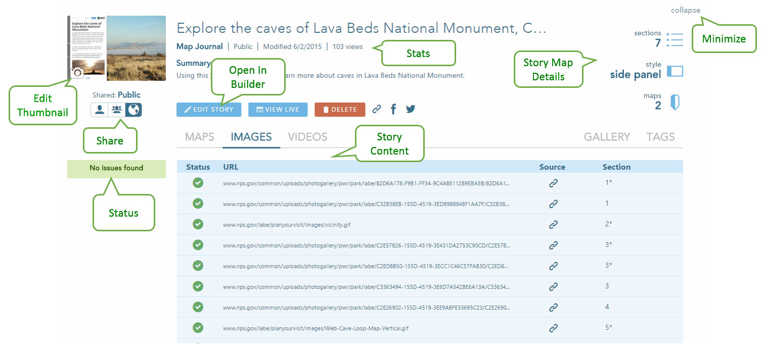 My Stories is a one-stop place to view and manage your hosted story maps. My Stories presents detailed information about your story maps and includes tools for viewing, sharing, editing, and checking status—so you can identify and correct any issues, ensuring that all of your stories are the best they can be and work correctly for the level of sharing you have chosen.