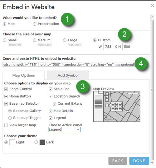 - Copy the code for embedding the map in your website then click Done. The HTML can then be incorporated into your website.