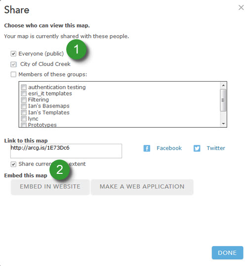 In order to embed a map in a website it must be shared with Everyone. From the Map Viewer click the Share button, then: