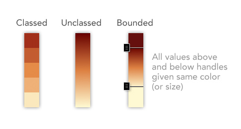 For years in cartography there were two choices when dealing with numeric data: Class your data into a few ranges (e.g., 0-10, 11-20, 21-30, …) or apply a continuous size or color ramp from the lowest to highest value. The problem is that both options have well-known limitations. For example, classification can mask important details by overgeneralizing, and many authors aren’t sure how many classes to use or which classification method is best for their data. On the other hand, unclassed maps can be made useless by one or two extreme values (outliers) making everywhere look the same except for one giant or tiny outlier. In print maps, it can be hard to match a color on the map with one in the legend. Fortunately, in this interactive digital age, we can click on our maps to see precise values whenever we need them, further reducing the need to classify our data.