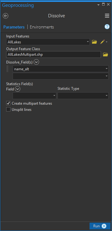 I dissolved all of the features in my view into one multipart feature using the Dissolve tool. The dissolve tool is an old friend of the GIS folk, one of the very first tools taught to new map makers. I dissolved the lakes by an attribute that was the same for all features (if you don’t have an attribute that all of your features share, you can just make a new field and fill it with a default of 0).