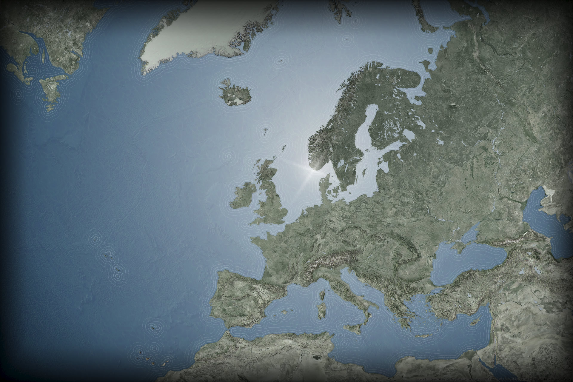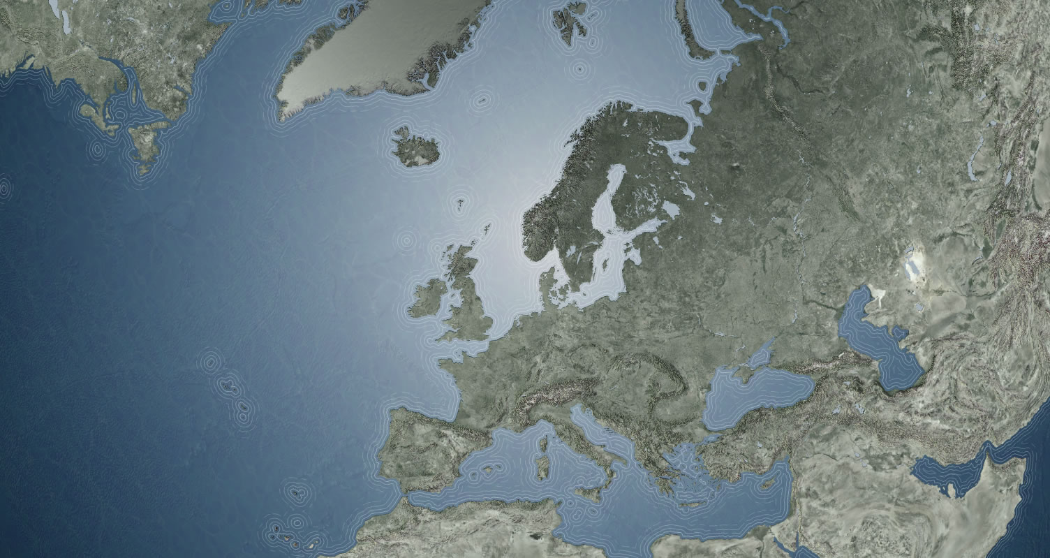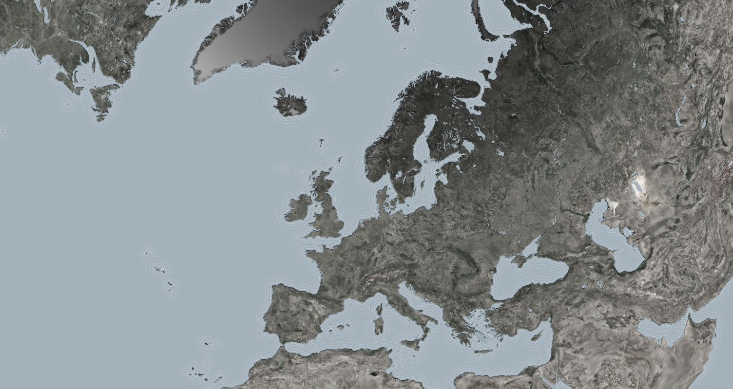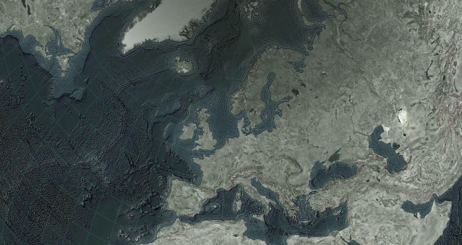 I got to thinking that I should try to do something similar with a map, but rather than the subdued cartographic water gradients that I was used to seeing, I’d try to ratchet up the gradient to something like real life, which, like lots of things in real life, is actually pretty extreme. Also, in the examples I’d seen, the gradient was typically applied to each water body independently, resulting in a series of radial gradient lakes. I wanted the radial gradient to fill them as though they were a single surface, to help reinforce the singular curved face of planet.