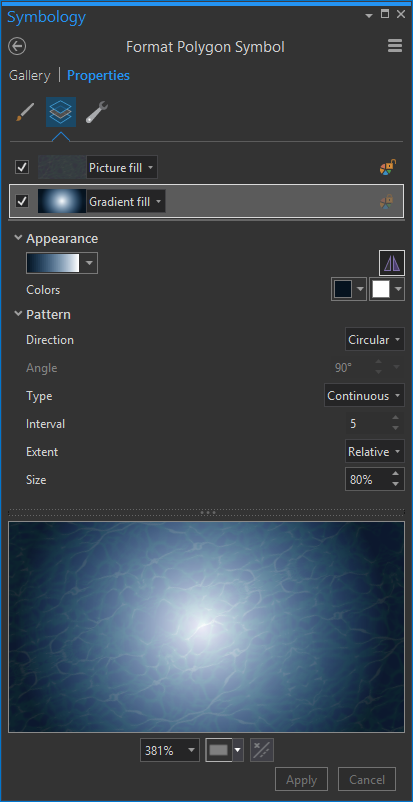 Next, I changed the lake polygon fill from solid to a radial gradient of white to dark-water blue. Play with the Pattern settings until you get a radial effect that works for you. I also added a water ripple texture (steal it here) because I just can’t help myself from doing stuff like that. I have to admit, I caught myself just staring into the abyss of this fill symbology.