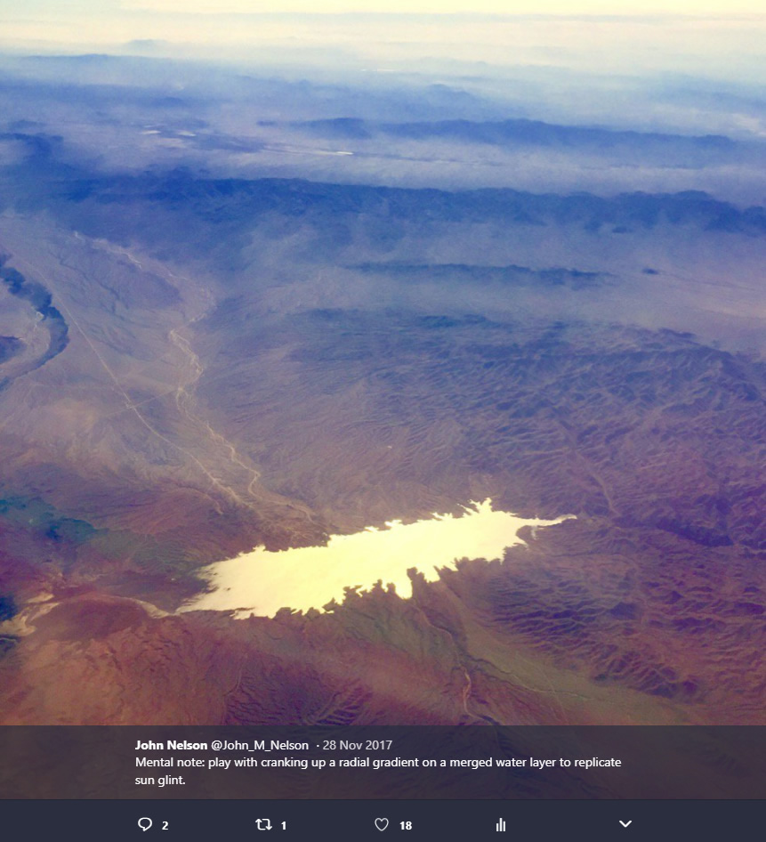 Hey now, that looks kinda-pseudo-plausibly-realistic! And that’s all there is to it…pretty much. If you want to crank this up to eleven, then you’ll have to add a sunglint image in your ArcGIS Pro layout. Just like in real life, there is often a sharp flare of light right where the nadir of the rays bounce directly up into your airborne pupils.