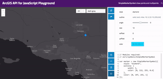 The Symbol Playground can also be used to answer the following questions: What does the default SimpleMarkerSymbol (or any other symbol) look like? What values can I use for each symbol property?