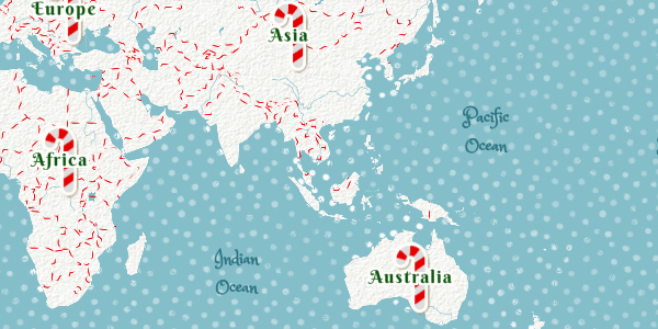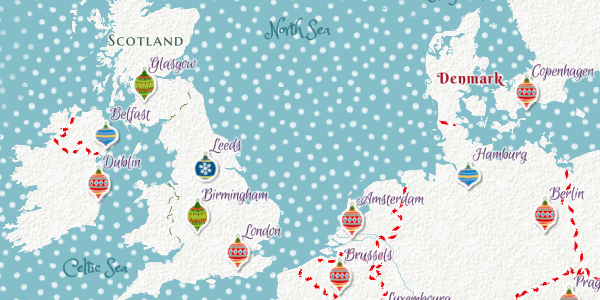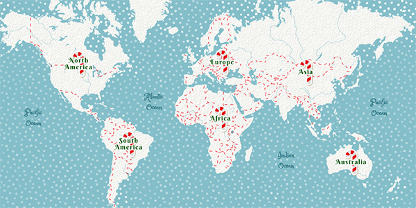 4. Think of the map components and how the inspiration can transform a feature or style on the map. In this example, city dots were changed to ornaments, there are continental candy canes, and candy cane ribbon for the international boundaries. These are but a few of the many other unique holiday twists within the map.