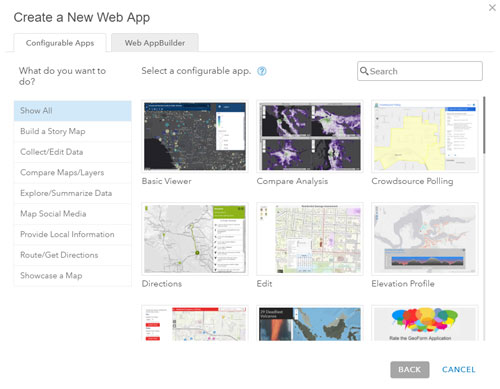 Once you’ve authored a map, you can complete the user experience by creating a web app. You can create a web app by choosing from a pre-established collection of configurable app templates, or using Web AppBuilder to create a custom app using a library of configurable widgets.