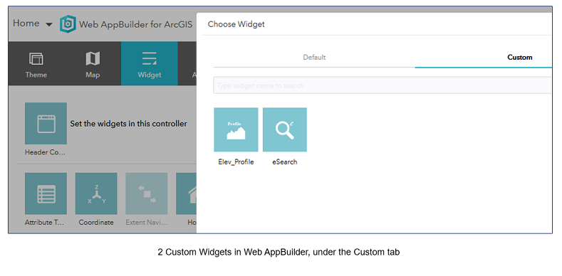 Custom widgets in Web AppBuilder are accessed in the builder environment on the Widgets tab. When you add a new widget, on the Choose Widget dialog, there is a new Custom tab which will display all of the custom widgets registered with Portal that you have permission to access. You can select the custom widget and use it in the builder environment like any other widget. This makes enabling new, custom functionality in Web AppBuilder in Portal for ArcGIS very easy and as a seamless user experience.