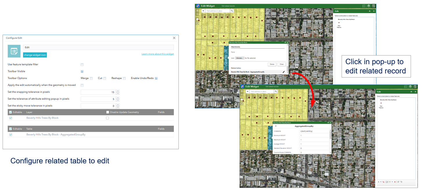 Edit widget – The biggest enhancement is the much requested ability to edit related records with the Edit widget. When feature layers with related tables are accessed, you have the option to enable editing on the related tables when configuring the widget. The widget supports editing from origin to destination tables for “one-to-one” and “one-to-many” relationships.