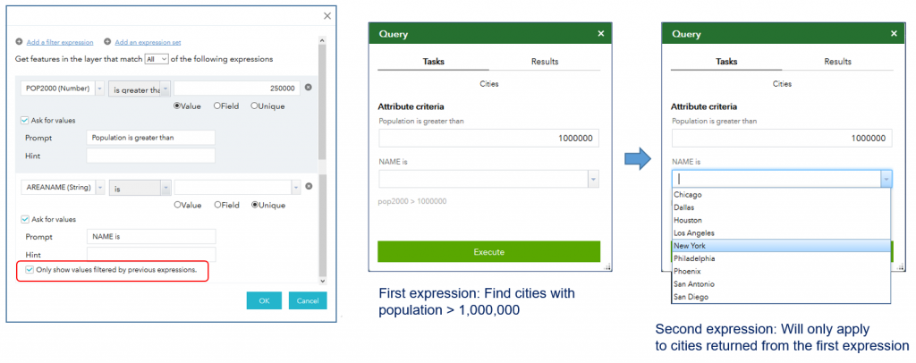 In the figure above, a Query widget is configured on the Cities layer with two expressions. The first finds cities with populations greater than 250,000 (by default); the second searches for a specific city by name. In the center graphic, when the expression to find cities with populations greater than 1,000,000 is entered into the Query widget, the second expression will only be applied to the results subset returned by the first expression. In other words, only cities with a population greater than 1,000,000 will appear in the dropdown list of the second expression. Once both expressions are filled in, you can run the query.