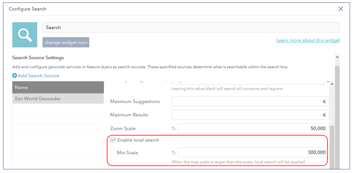 Search widget – A new option called “local search” enables you to set a minimum map scale for the widget. It is meant to work with the Esri World Locator service. When you perform a geocode search, returned results are ranked based on how closely they match the geocode request. You can now control the threshold map scale that helps to prioritize the returned results.