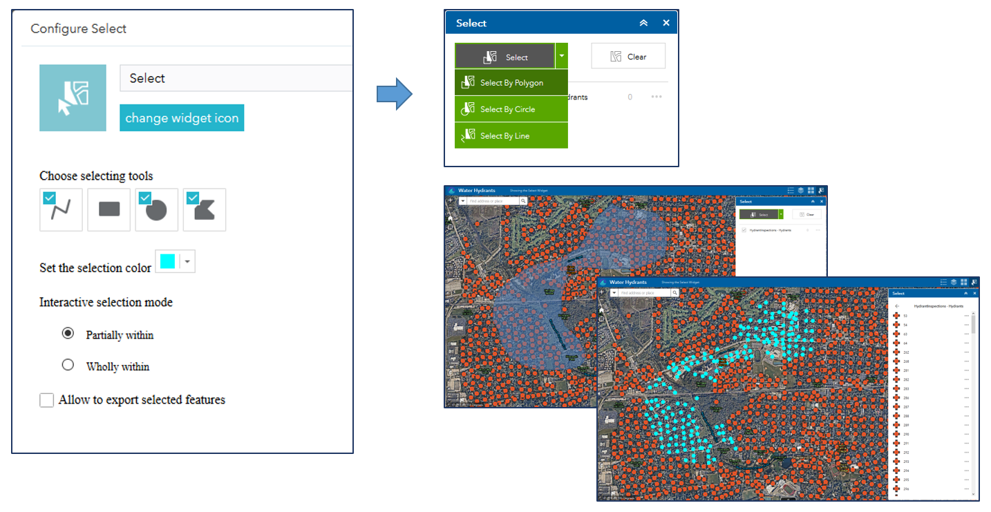 Select widget – Based on many user requests, we have added more feature selection tools. Now you can select features with a polyline, polygon, and a circle in addition to the rectangle select tool.