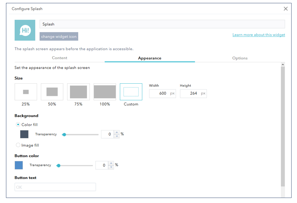 Splash widget – Its configuration options have been extended to enable you to create more customized splash screen displays. More options for configuring the appearance include the ability to specify its size, background, transparency, button and text colors.