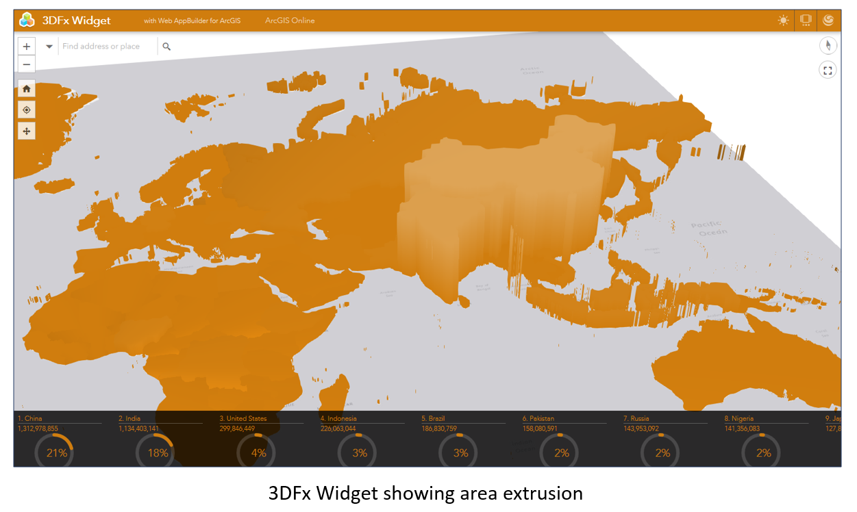 For 3D web apps, the 3DFx widget has a new visualization type for area extrusions, which can provide some new unique visualizations. In the figure below, it shows world populations for each country. Currently, the visualization is limited to a single color, but we’re looking into extending the rendering capabilities of the 3DFx widget in a future release.