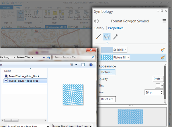 Tiles are added as a Picture Fills in ArcGIS Pro. Once established they can be reduced or enlarged, but keeping them at the same size will make the final effect more predictable. Keep the tile size down if you can, and don’t go above 512 ppi.